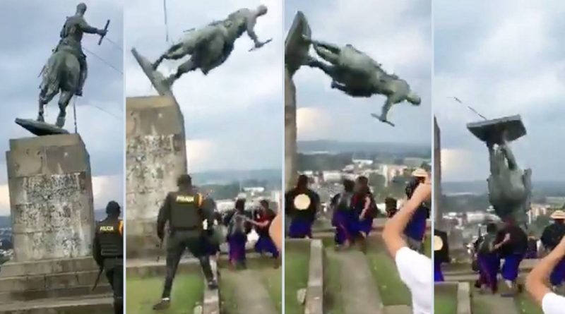 Indígenas de la comunidad Misak derribaron este miércoles una estatua ecuestre del conquistador español Sebastián de Belalcázar situada en el municipio de Popayán, en el departamento colombiano del Cauca, al suroeste del país.