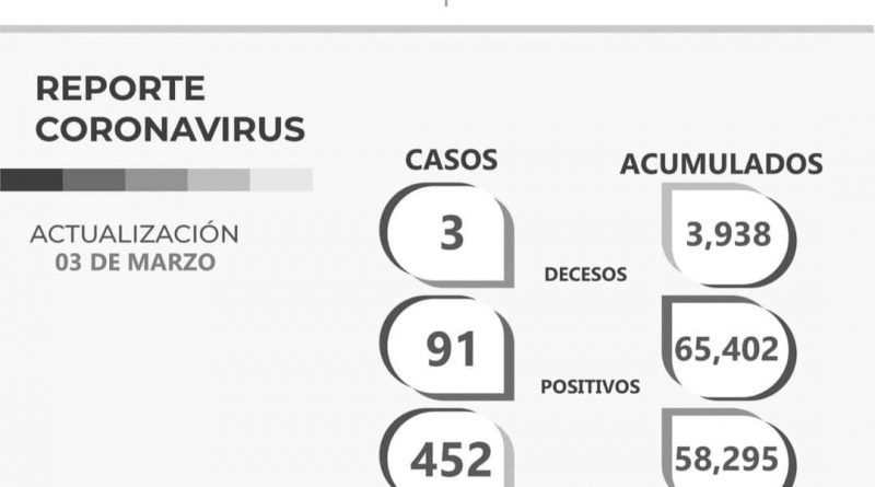 Zacatecas, Zac.- La Secretaría de Salud de Zacatecas (SSZ), informó que hubo 91 nuevos contagios de casos positivos, y 452 personas recuperadas de Covid-19, lamentablemente tres decesos asociados a la enfermedad. La entidad alcanzó un total de 58 mil 295 personas en condición de recuperadas.