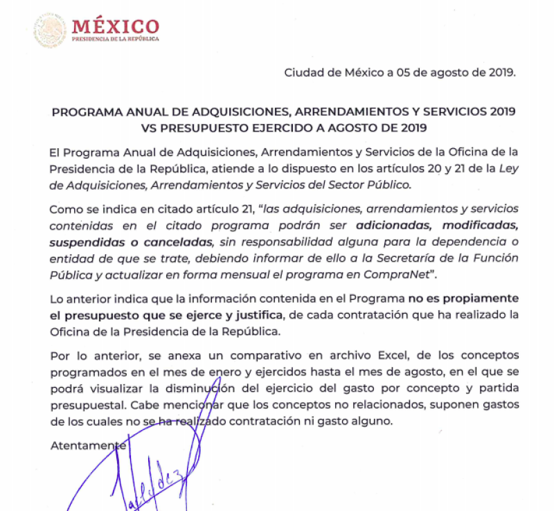 El senador panista Julen Remetería dio a conocer este lunes un documento del “ Programa anual de adquisiciones, arrendamientos y servicios del sector público 2019” de la Presidencia de la República, en el que se presupuestan productos y pagos de servicios que se contraponen a la austeridad republicana anunciada por el presidente Andrés Manuel López Obrador.