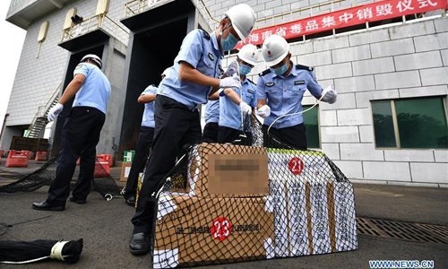 Los miembros del personal se preparan para destruir drogas en una central eléctrica de incineración en el condado de Chengmai, provincia de Hainan, sur de China, el 3 de junio de 2019. Las autoridades de la provincia de Hainan, en el sur de China, destruyeron más de 280 kg de drogas en una central eléctrica de incineración en el condado de Chengmai. Foto: Xinhua