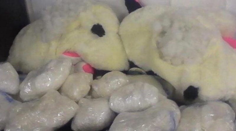 Sin embargo – El binomio canino ubicó una caja de cartón en la que se localizaron 12 paquetes ocultos dentro de dos muñecos de peluche, cada uno de ellos con una sustancia sólida y cristalina, con características propias de la metanfetamina, con un peso aproximado de siete kilos 920 gramos. El cargamento tenía como destino la ciudad de Tijuana.