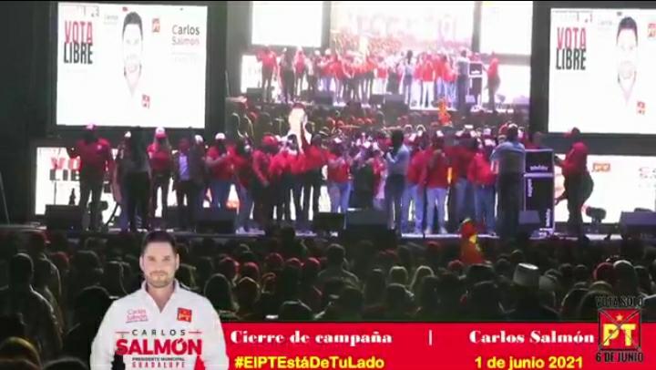 Guadalupe.- El candidato a presidente municipal de Guadalupe, por el Partido del Trabajo,Carlos Salmon, llevó a cabo su cierre de campaña el pasado martes 01 de junio donde amenizando el evento estuvo la Fe Norteña, donde se dieron cita cientos de guadalupenses.