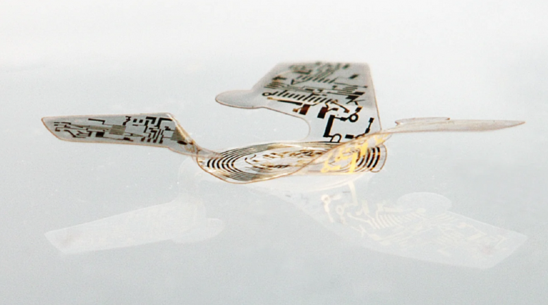 Microchip volador diseñado para monitoreo de entornos. Crédito: Northwestern University.