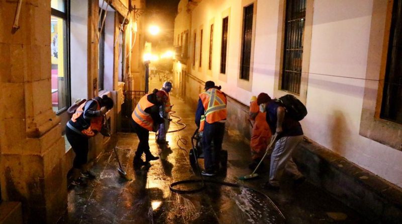 Nuevamente, la noche de este domingo se llevó a cabo la limpieza de algunas de las principales calles del centro histórico capitalino, labor a cargo de los encargados de desinfección de la presidencia municipal.