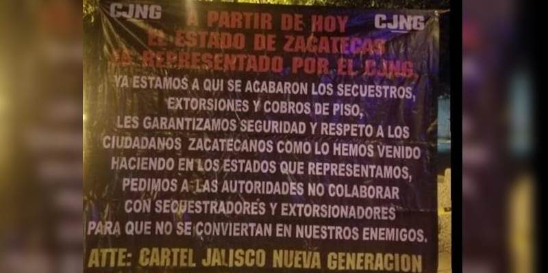 “Ya estamos aquí. Se acabaron los secuestros, extorsiones y cobros de piso. Les garantizamos seguridad y respeto a los ciudadanos zacatecanos” decían las mantas.