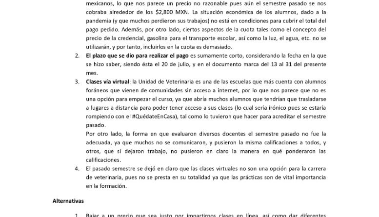 Otro punto que tocan en la petición es el replanteamiento de clases virtuales debido a que estudiantes de la carreta de mvz cuenta con una alta cuota de foráneos y hay zonas donde no hay señal internet, además de que no representan una forma viable de enseñanza y que para la carrera las prácticas presenciales son vitales.