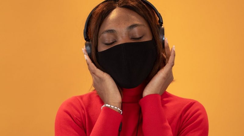 Mujer con mascarilla para protegerse de enfermedades infecciosas, lentes de sol y auriculares para escuchar canciones virales.