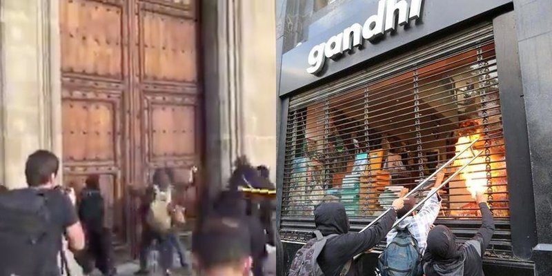 Encapuchados vandalizan Palacio y tiendas durante marcha de Ayotzinapa
