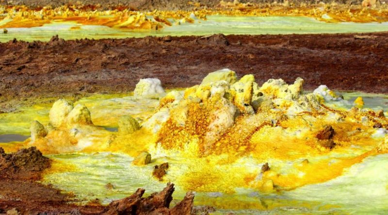 El volcán Dallol se encuentra a 125 metros bajo el nivel del mar. Su actividad hidrotermal es alimentada por el agua que ha sido calentada por la reserva de magma (lava) poco profunda debajo del volcán.