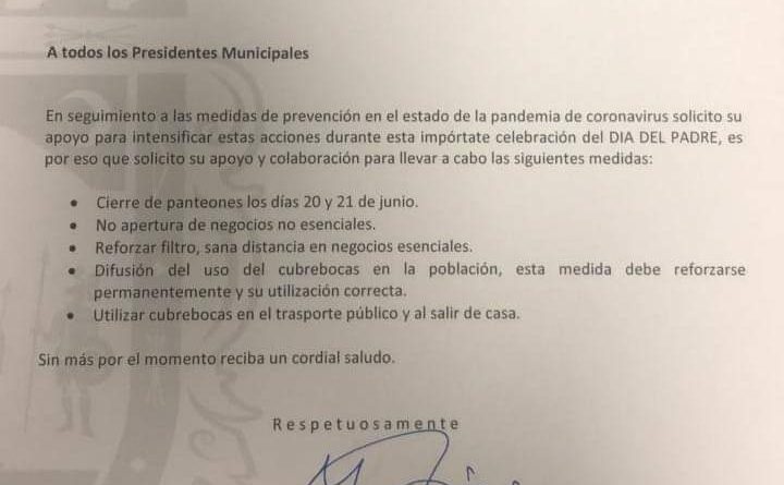 Desde el pasado jueves, la Secretaría de Salud de Zacatecas notificó a los presidentes municipales del estado de las acciones que exhortó a que se tomen, entre éstas el cierre de panteones este 20 y 21 de junio.
