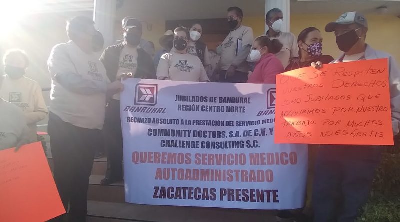 Zacatecas.- Por la mañana los jubilados de BANRURAL, un banco ya inexistente se manifestaron según argumentaron por la falta de servicios médicos a este gremio, pues dicen les fue suspendido en su totalidad y no reciben atención en hospitales ni con medicamentos.