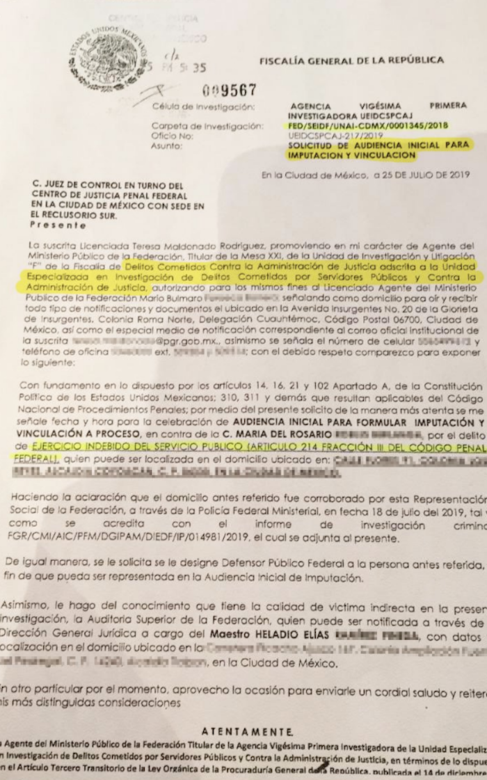 “Asimismo, le hago del conocimiento que tiene ella calidad de víctima indirecta en la presente investigación, la Auditoría Superior de la Federación, quien puede ser notificada a través de la Dirección General Jurídica a cargo del Maestro Heladio Elías, con datos de localización en el domicilio ubicado en la Ciudad de México”.
