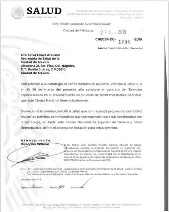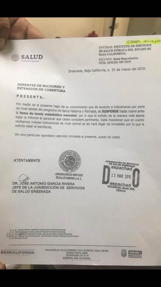 En las mismas se informó que a partir del 26 de marzo concluyó un contrato con una empresa que dotaba al sector de “servicios especializados en el procesamiento de pruebas de tamiz metabólico neonatal”, por lo que cada centro de salud donde se aplicaba deberá realizarlo son sus propios recursos “para darle continuidad”.