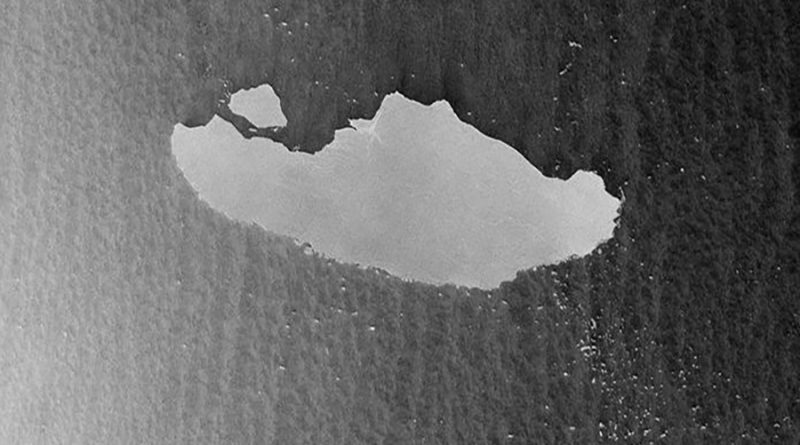 Las imágenes tomadas por el satélite Sentinel-1 de la Agencia Espacial Europea muestran que el gigante iceberg A-68, arrojó un enorme trozo de hielo que mide 175 kilómetros cuadrados mientras se sumerge en un clima cada vez más cálido aguas al norte de la península antártica.