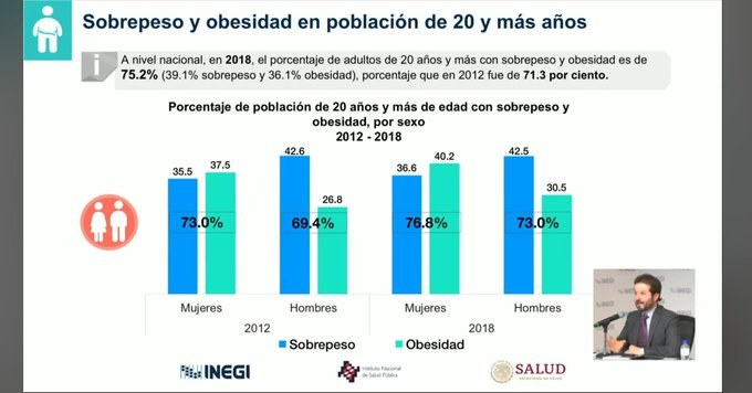 El sobrepeso y obesidad sigue en aumento en México con 75.2 por ciento de los adultos con esta condición. Es un aumento de cuatro puntos porcentuales respecto a la medición que se hizo en 2012, revelan los primeros datos de la Encuesta Nacional de Salud y Nutrición (Ensanut) 2018.