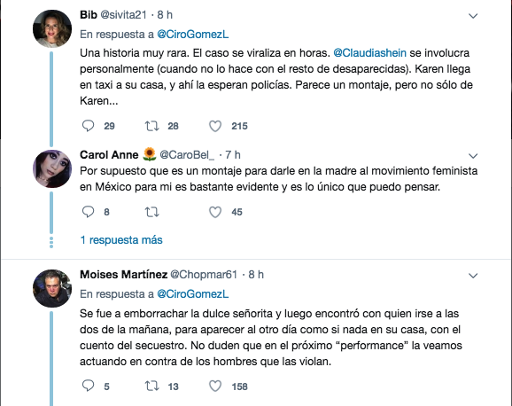 Por otra parte, usuarios expresaron sus dudas sobre la manera en que el caso fue desarrollado; algunos comparten sus hipótesis, señalando que esto va a afectar al movimiento feminista, quien en días pasados ha tenido un impacto mediático fuerte, derivado de las manifestaciones realizadas.