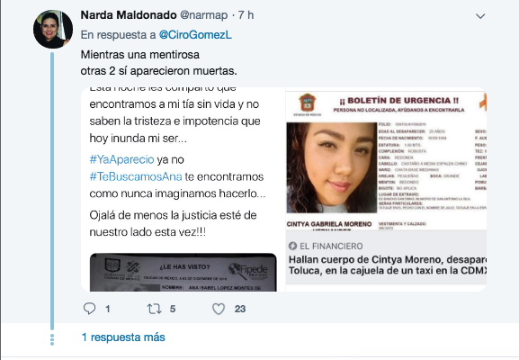 En su red social, indicó que los protocolos de búsqueda se emprendieron después de darse a conocer el reporte de la desaparición en coordinación con la SSC-CdMx, y el Centro de Comando, Control, Cómputo, Comunicaciones y Contacto Ciudadano (C5) local.