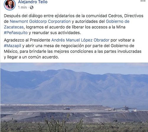 El Gobernador del Estado de Zacatecas, Alejandro Tello, celebró la liberación de los accesos a las instalaciones de la minera Peñasquito, en el municipio de Mazapil.