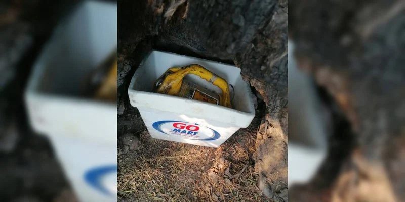 La fuente se encontraba al interior de una hielera de unicel de la Go Mart en medio de tierra pasto seco.