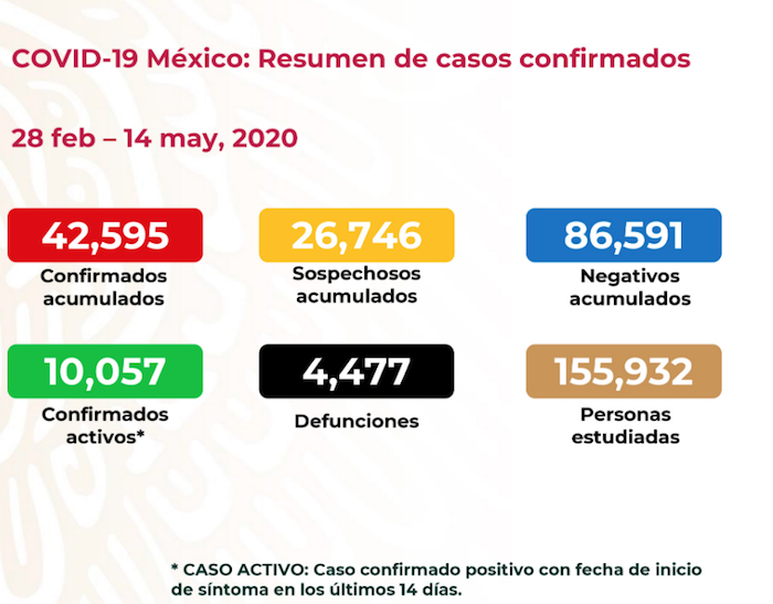 Los casos confirmados activos (los que se detectaron en los últimos 14 días) rebasaron en las últimas 24 horas los 10 mil (10 mil 057). El número total de casos confirmados acumulados es de 42 mil 595, detalló José Luis Alomía Zegarra, director general de Epidemiología de la Secretaría de Salud federal.
