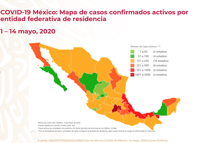 Hay, además, hasta la tarde de este jueves 14 de mayo, 26 mil 746 casos sospechosos acumulados, y 86 mil 591 negativos. Se han estudiado, desde el inicio de la epidemia, 155 mil personas en México.