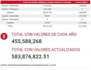 Pero los números del Centro de Estudios, Biblioteca y Museo Vicente Fox Quesada (Centro Fox), la asociación civil que fundó en 2007, apenas retomó la vida civil, contrastan con sus palabras. De 2007 a 2018, recibió en donativos 452 millones 63 mil 582 pesos. En el mismo periodo, la fundación “Vamos México”, de su esposa, Martha Sahagún Jiménez, cuyas operaciones se iniciaron en 2001, tuvo 131 millones 813 mil 240 pesos.