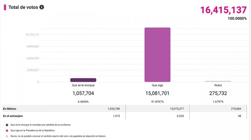 En el corte del INE a las 9.26 de la mañana del día lunes se llevaba un conteo de 16, 415, 137 votos de los cuales, 1,057,704 votos fueron para que se le revocara el mandato, 15, 081, 701 fueron de que continuara y nulos de 275,732.