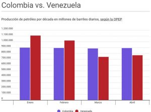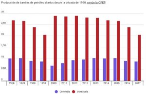 En el caso de Colombia, el Gobierno reportó la producción de 884.815 barriles diarios en marzo de 2019, mientras que la OPEP reportó en Venezuela la producción de 740.000 barriles por día, lo que representa la primera vez desde 1960 que Colombia tiene más producción petrolera que Venezuela, según registros de esa organización.