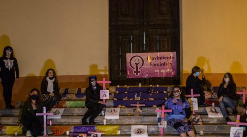 ZACATECAS.- Colectivos feministas de la entidad realizaron un montaje y concentración en las escalinatas del templo de San Agustín en memoria de todas las victimas de feminicidios en Zacatecas.