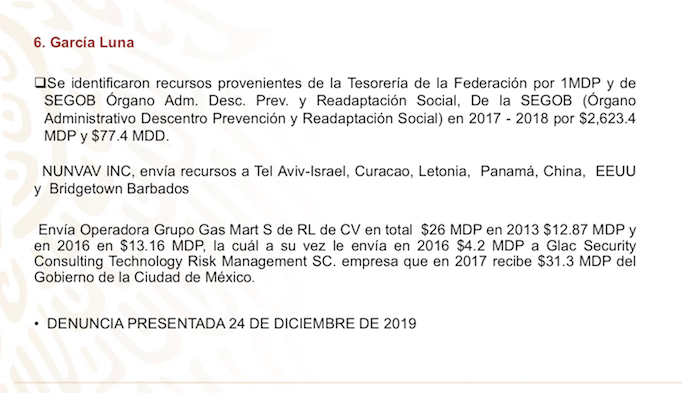 “Creo que es importante destacar que no solamente se trata de la triangulación de recursos a su empresa, sino que tenemos un elemento también importante y hemos detectado que esta empresa panameña le pagaba el modo de vida en Miami al señor García Luna”, reveló.