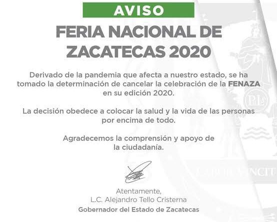 Tras el anuncio de la cancelación de la Feria Nacional de Zacatecas edición 2020 debido a medidas de protección contra la pandemia COVID-19 y al ser uno de los estados más afectados y con mayor índice de contagios, se anunció que hasta el momento no se tenía previsto un solo peso para la realización de la misma.