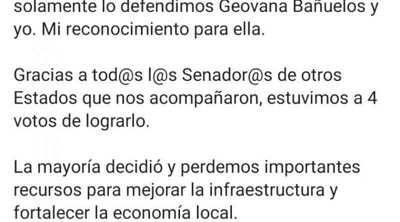 La mayoría decidió y Zacatecas perderá importantes recursos para mejorar la infraestructura y fortalecer la economía local, agregó la senadora.